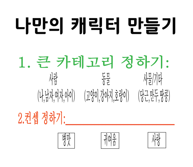 ① 큰 카테고리를 정합니다 =나는 어떤 것을 그리겠다 그중에는 밑에 기재한 것처럼 사람, 동물, 사물/기타 이렇게 크 게 나눠집니다.. 물론 그 안에는 또 괄호 안에 처럼 세부적으로 나눠지겠죠