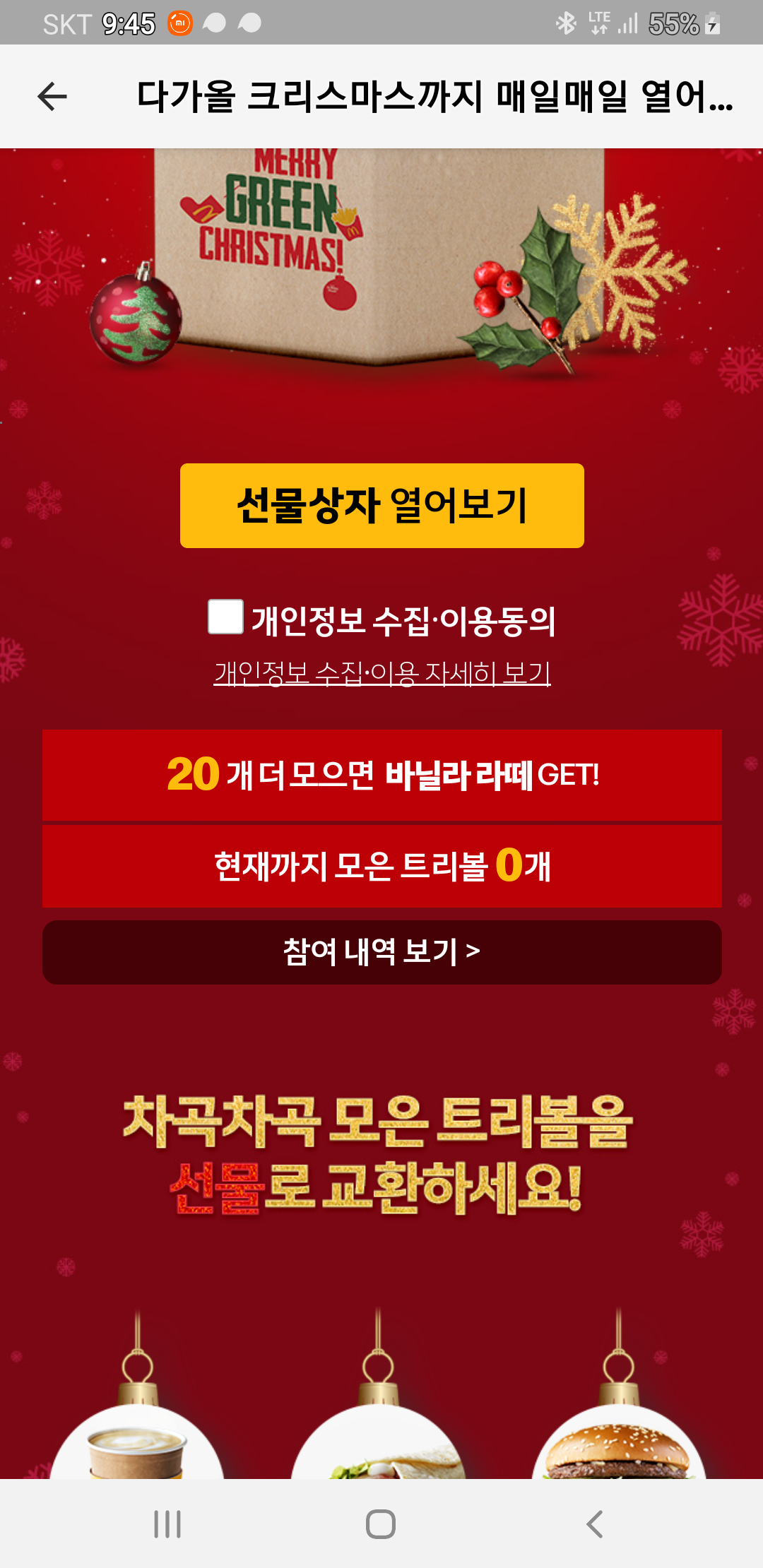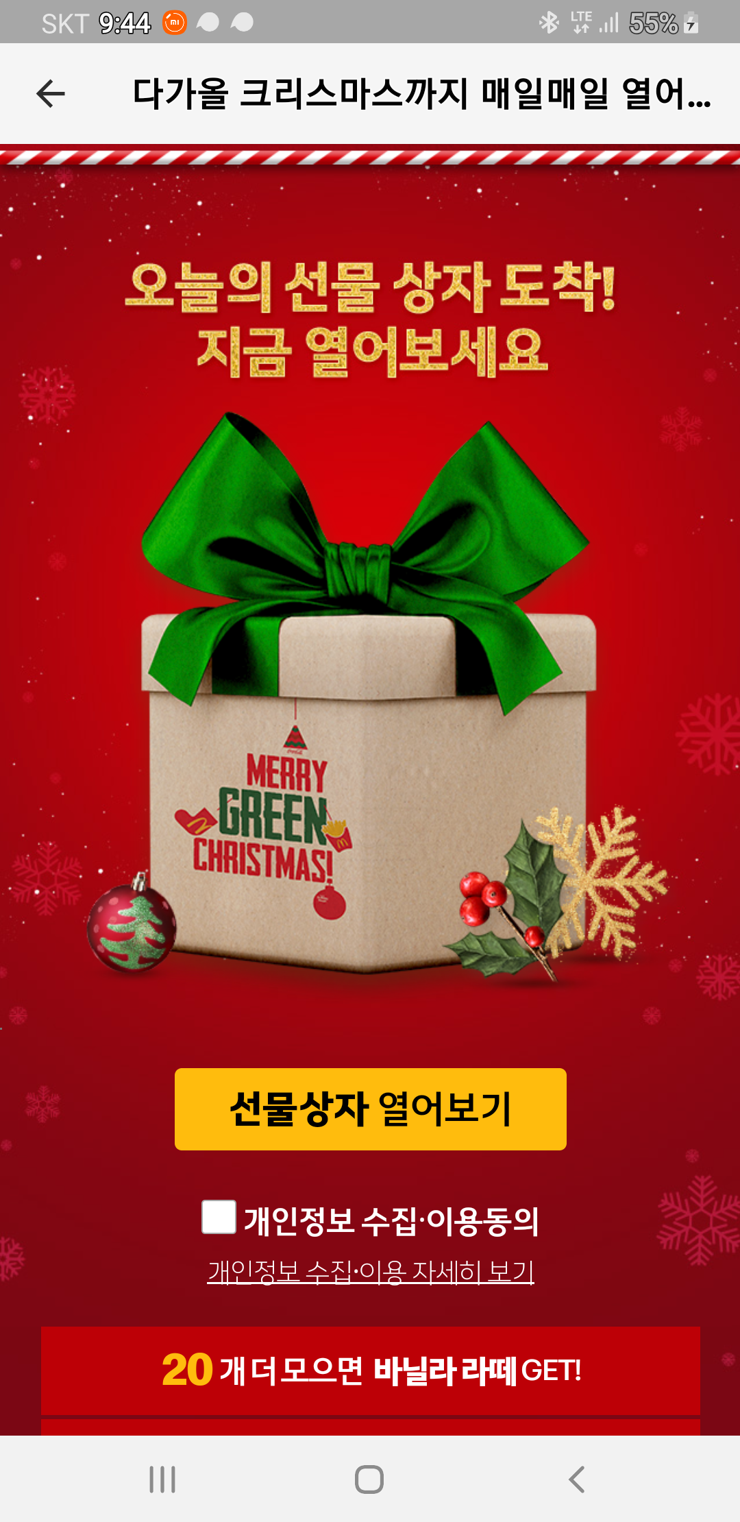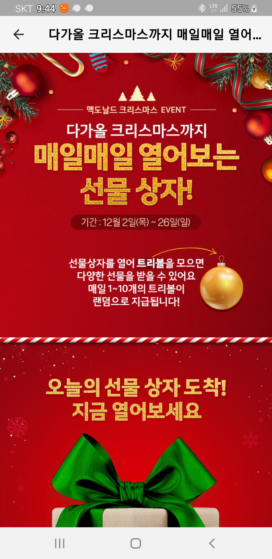 맥도날드 어플에서 매일매일 열어보는 선물 상자 이벤트를 합니다.