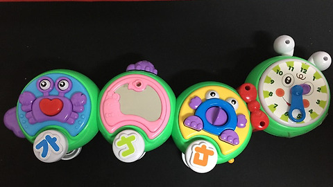 사진을 보시면 꽃모양은 줄로 연결이 되어 잡아 당기면 음악이 나오고, 공모양을 손가락을 긁으면서 돌돌돌 돌리는 놀이가 되면서 음악이 나와요, 나비모양의 날개는 책을 넘기듯이 하면 음악이 나와요, 그리고 무당벌래는 시계 방향과 반대 방향으로 돌리다 보면 음악이 나와요. 마지막으로 큰 애벌래 모양중 1234 모양에서 음악이 흘러나오고 머리에는 다른 음악이 흘러 나오죠